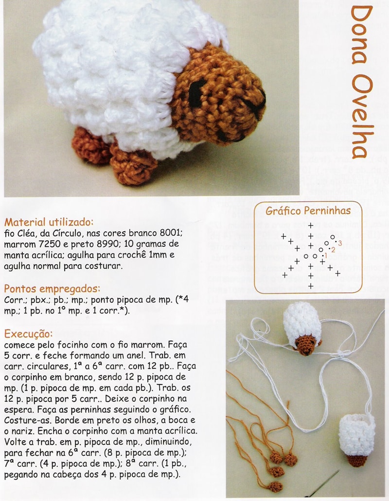Comece separando todos os materiais que você vai utilizar em seu artesanato. Faça 5 correntinhas com a linha marrom e feche com pontos baixíssimos. Faça 6 carreiras com pontos baixos, para fazer a carinha. Depois faça 5 carreiras de ponto pipoca e reserve. Faça as patinhas seguindo o gráfico. Borde a carinha da ovelha com a linha preta e fazendo o modelo de carinha que você desejar. Encha a ovelha com o enchimento e continue fazendo mais 3 carreiras de ponto pipoca, porém, diminuindo as pipocas, para fechar. Arremate a linha. Para finalizar a sua peça, costure as partes. E está pronto!