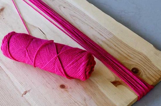 Comece esticando a lã em uma mesa, dando várias voltas, ou enrolando a lã em um pedaço de papelão. Porém tanto a mesa quanto o pedaço de papelão deverão ter em média 70 cm.