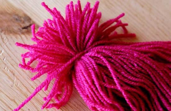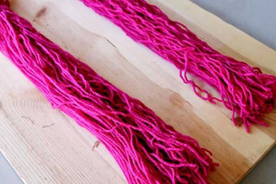 Após dar muitas voltas com a lã na mesa ou no pedaço de papelão, corte ao meio formando dois punhados com 35 cm de comprimento (metade da medida que foi usada pra enrolar os fios).