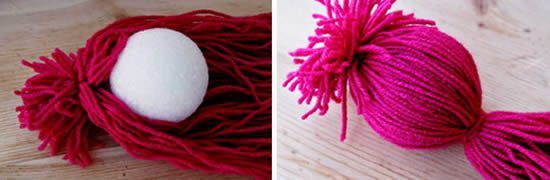 Em seguida, posicione a bola de isopor entre os fios de lã para formar a cabeça do polvo. E assim que arrumar todos os fios ao redor da bola de isopor, amarre outro pedaço de lã logo abaixo da bola.