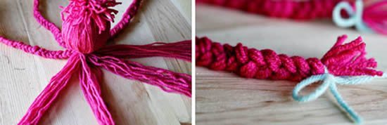 Em uma das extremidades amarre um pedaço de lã, formando o cabelinho. Amarre a uma distância de 6 cm da extremidade.
