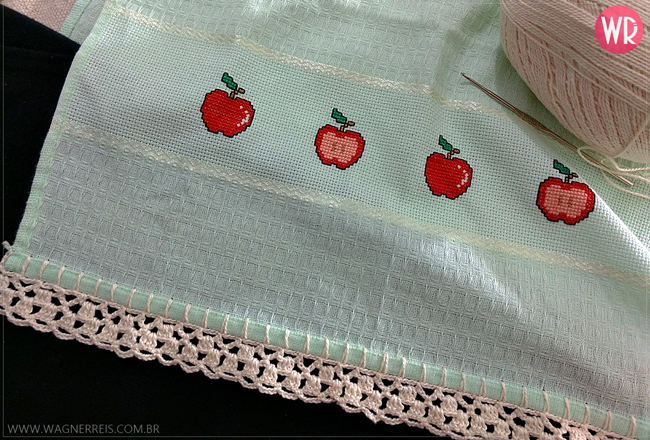 Comece separando todos os materiais que você vai utilizar em seu artesanato. Faça o caseado na borda do tecido da maneira que você quiser. Neste modelo, você passa a linha pelo tecido, faz 4 correntinhas, passa a linha pelo tecido, mais 4 correntinhas, e assim até o final. Este bico de crochê consiste em fazer na primeira carreira 5 correntinhas e 1 ponto baixo. Na segunda carreira faça 3 pontos altos dentro da argola de correntes, 3 correntinhas e 1 ponto baixo; 3 pontos altos, 3 correntinhas e 1 ponto baixo, e assim até o final da carreira. Na terceira carreira você deve fazer 3 pontos alto dentro da argola de correntes, 2 correntinhas, 3 pontos altos dentro da argola de correntes e 2 correntinhas; 3 pontos altos e 2 correntes até o final da carreira. A última carreira consiste em fazer 3 pontos altos apenas no início e no final da carreia e no meio fazer 5 correntinhas e 1 ponto baixo.