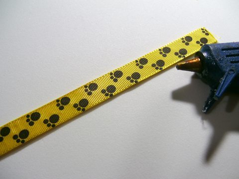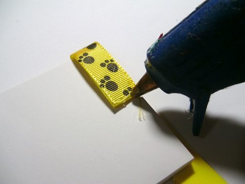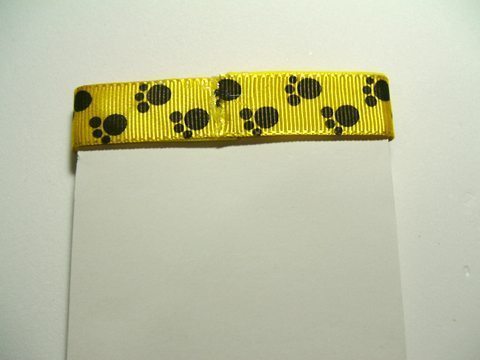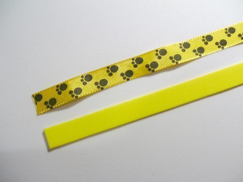 Agora, corte uma tira de EVA amarelo com tamanho de 18 cm x 1,5 cm e cole por cima a fita com patinhas.