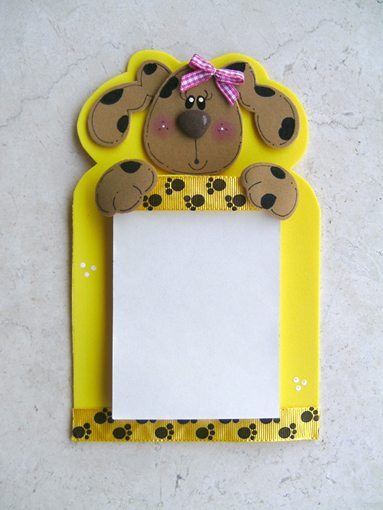 Em seguida, para finalizar a sua peça, faça um laço com a fita xadrez e cole na base de uma das orelhas de sua cachorrinha. Depois cole na parte de baixo do bloquinho um pedaço da fita de patinhas. Com a tinta acrílica branca e o pincel, faça o pontinho de luz nos olhinhos, na bochecha e 3 pontinhos perto do bloquinho. E está pronto!