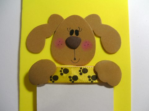 Em seguida, cole a cabeça da cachorrinha rente à borda superior do bloquinho e cole uma patinha em cada canto superior do bloco.