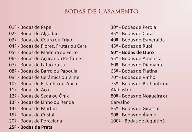 Tabela de bodas de casamento até 100 anos
