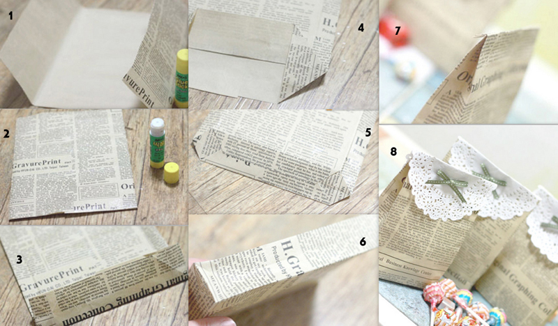 Corte uma tira larga no papel, para colar as pontas e criar um saquinho. Dobre o fundo e cole. Dobre as laterais para dentro.