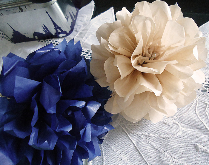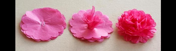 Corte vários círculos com borda com curvinhas no papel de seda. Posicione as camadas juntas, mas com as curvinhas intercaladas. Grampei no meio, com 2 grampos. Para criar a flor, basta ir levantando as camadas de papel, modelando em formato de flor.