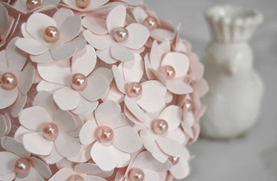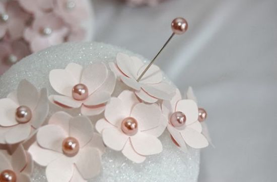 Para fazer este artesanato delicado você irá precisar de: papel cartão, cartolina ou papel para scrapbook na cor rosa pérola (ou com a cor de sua preferência); alfinetes com ponta de pérola; bola de Isopor (com o tamanho de sua preferência); cortador de papel modelo flor ou tesoura e molde de flor.