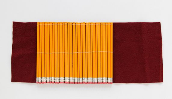 Comece cortando um retângulo, no feltro, com a mesma altura do lápis e comprimento um pouco maior que os 30 lápis posicionados lado a lado. Depois basta ir costurando os lápis pelo retângulo, com o auxílio da agulha de mão e da linha para costura. Passe costuras em cada extremidade e também no meio dos lápis e de forma bem firme, para que eles não se soltem posteriormente, enquanto você estiver usando a bolsa de mão. E apare as sobras de tecido.
