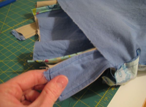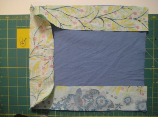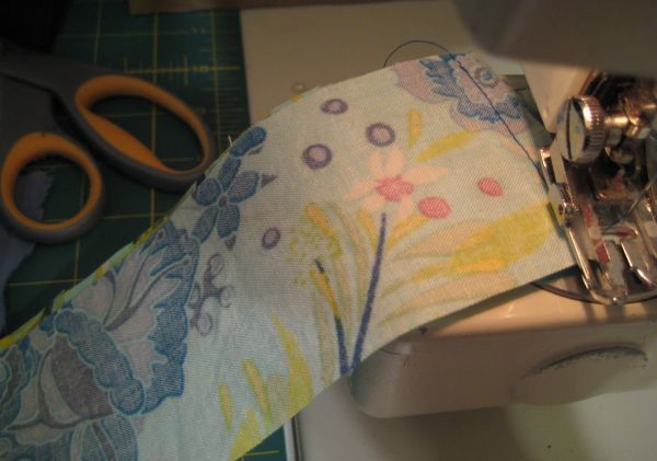 Agora, costure duas tiras de tecidos juntas, com os diretos para dentro, nas pontas. Esta será a parte lateral da bolsa.