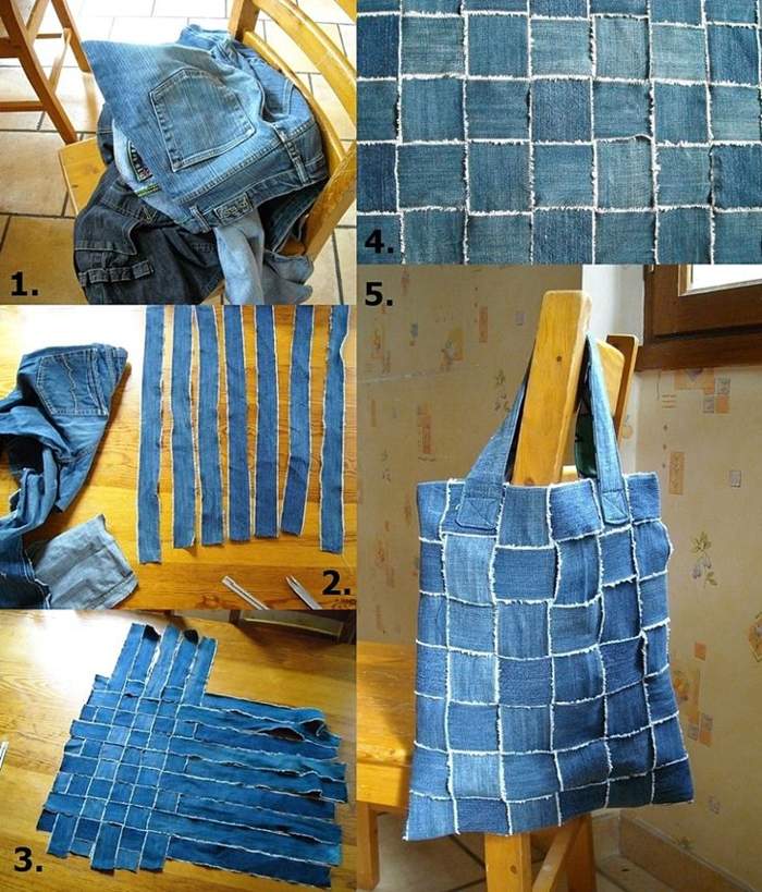 Faça uma bolsa de jeans cortando tiras da calça e trançando estas tiras até chegar a um quadro ou a um retângulo. Trance duas partes iguais. Costure as laterais e o fundo das partes e faça alças para a sua bolsa.