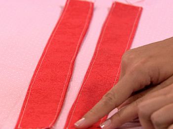 Comece fazendo primeiro as alças da bolsa, cortando e costurando duas tiras com tamanho de 10 cm x 40 cm.