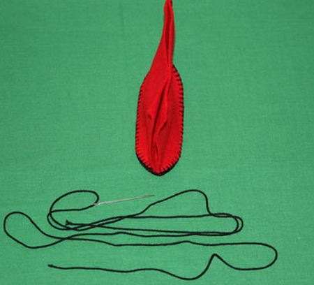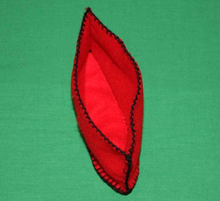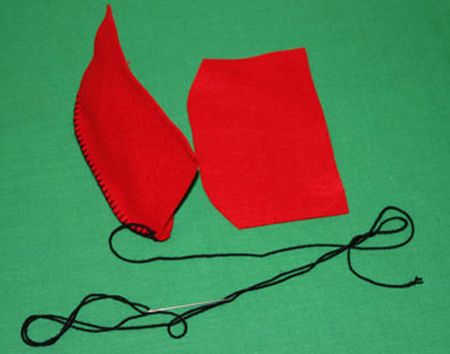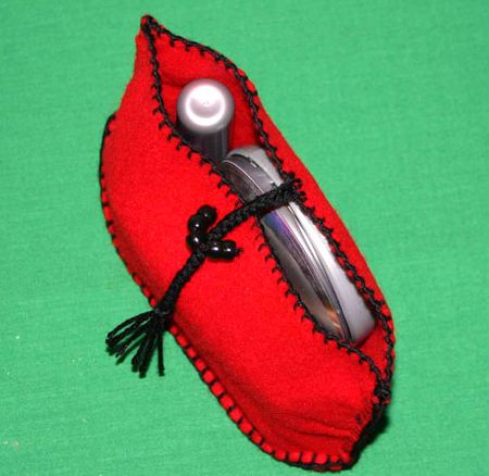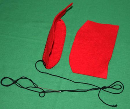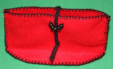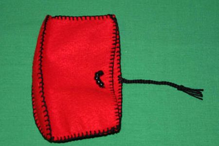 Em seguida, corte o papelão com tamanho um pouco menor do que a medida das partes da bolsa e posicione o papelão entre as partes da nécessaire e costure, com a linha da mesma cor do feltro e a agulha de tapeçaria, encapando estes pedaços de papelão.