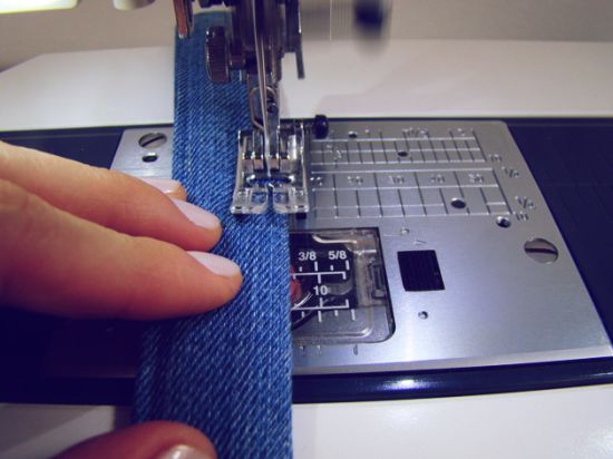 Corte o viés (tiras com 3,5 cm de espessura). Emende uma tira na outra.