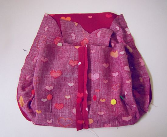 Para unir o forro com a parte externa da bolsa “vista” o jeans por dentro e o forro por fora. Alfinete ao redor da bolsa e costure na parte superior, cuidando para que o jeans e o forro estejam bem encaixados. Apare as rebarbas e abra no fundo um orifício com aproximadamente 5 cm para desvirar a peça.