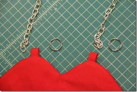 Agora, para finalizar a sua peça, se você for aplicar alças, posicione as argolas de metal e depois fixe as correntes de metal. E está pronto! Mas caso queira uma bolsa de mão basta não colocar as tiras de tecido e a alça.