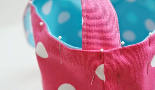 Logo após, junte as partes maiores (do corpo da bolsa), lado direito com lado direito, para cada cor de tecido. E começando pela borda superior, costure descendo por um lado, passando pela base e subindo pelo outro lado do corpo da bolsa usando uma margem de costura de 0,6 cm. Deixe a parte superior aberta.