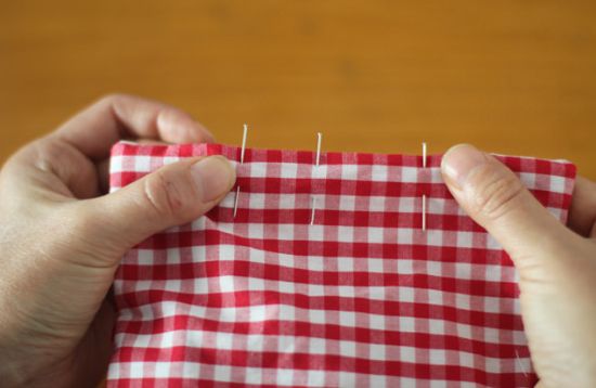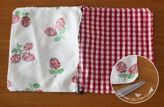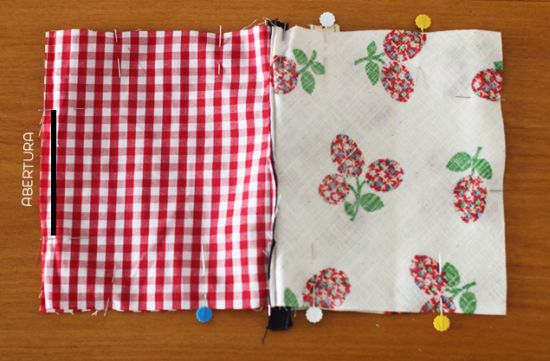 Logo após, abra a bolsinha, posicionando as duas partes do forro e as duas partes do tecido externo juntas, com tecidos iguais e lado direito com direito. Alinhe muito bem as bordas e alfinete ao redor. E deixe uma abertura de 8 cm na base do tecido do forro, para virar o trabalho posteriormente.