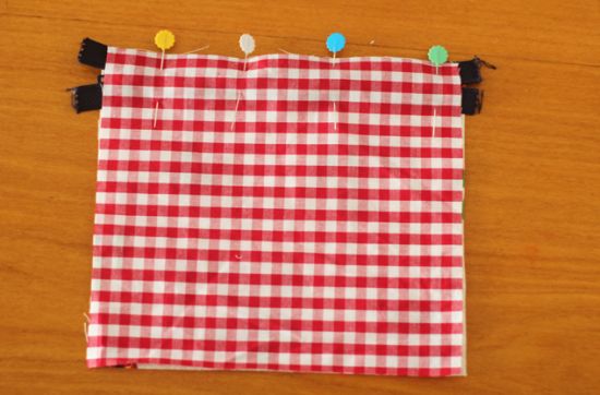 Em seguida, posicione o retângulo do forro sobre o zíper e o outro tecido, e com o lado direito para baixo. E prenda tudo com os alfinetes para costura.