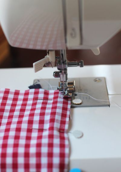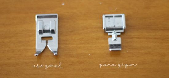 Logo após, fixe em sua máquina de costura a sapatilha para zíper. E passe uma costura reta para prender todas as partes juntas, porém atente para posicionar a sapatilha com a parte “livre” perto do zíper. E antes de começar a costurar abra o zíper até a metade; e no momento de passar com a sapatilha ao lado do puxador do zíper, deixe a agulha no tecido e levante a sapatilha, coloque a mão entre os tecidos e deslize o puxador para a parte do zíper que você já costurou. Este truque você pode utilizar em qualquer peça que você for costurar um zíper.