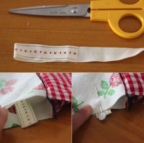 Agora, corte e dobre um pedaço da fita decorada e posicione em uma das laterais de sua bolsinha, prendendo-a com um alfinete, com as pontas para fora e a “laçada” para dentro.