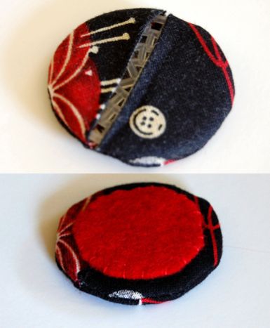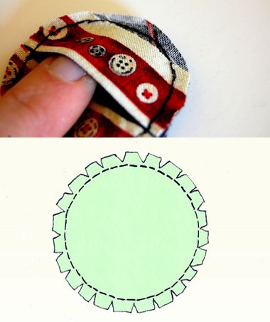 Em seguida, corte dois círculos no tecido escolhido, com tamanho um pouco maior que o tamanho do círculo de tela e deixe uma margem para costura. Corte um dos círculos ao meio e costure estas peças juntas, com os lados do direto dos tecidos para dentro. Aqui você pode costurar à mão ou à máquina. E faça piques ao redor de todo círculo.
