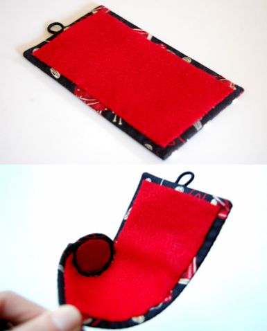 Em seguida, costure um pedaço do feltro vermelho na parte de dentro da bolsa e costure esta peça ao redor do círculo, porém deixando parte de cima sem costura, para você poder abrir e fechar a bolsinha.