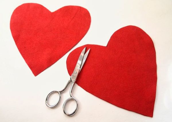 Comece escolhendo o tamanho do molde de coração que você quer, lembrando que quanto menor o coração, menor a sua bolsinha. E você pode fazer uma bolsa maior e um porta-moeda, com o molde menor, por exemplo. Depois corte, com o auxílio da tesoura, dois corações no feltro vermelho.