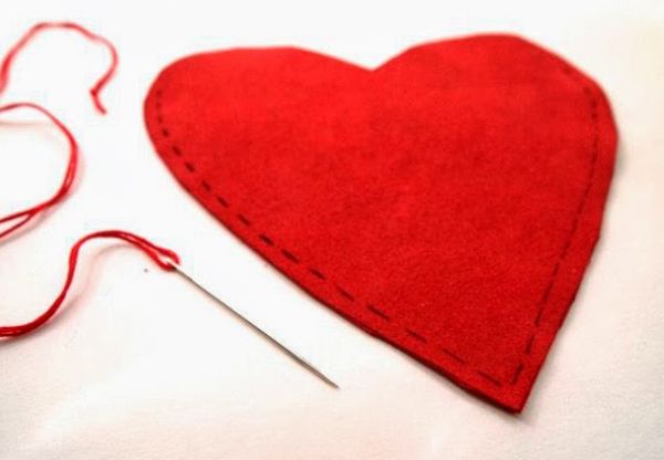 Em seguida, com o auxílio da agulha para bordado e da linha para bordado, costure com pontos à mão ao redor das laterais do coração, deixando a parte de cima aberta.