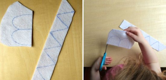 Comece desenhando as barbatanas (fazendo um ziguezague em uma tira) e desenhando a parte branca dos olhos, com formato ovalado em uma extremidade e formato reto na outra extremidade, no feltro branco. Depois recorte todas as partes, com o auxílio da tesoura.