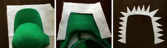 Em seguida, posicione o boné verde sobre um pedaço de feltro branco e risque ao redor da aba, para tirar a medida, e depois, recorte toda a peça, por dentro e por fora, com o auxilio da tesoura. Então desenhe e recorte os dentes na parte de fora de sua peça de feltro branco que você acabou de cortar.