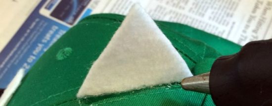 Logo após, comece a colar as barbatanas no topo do seu boné verde, com o auxílio da pistola de cola quente.