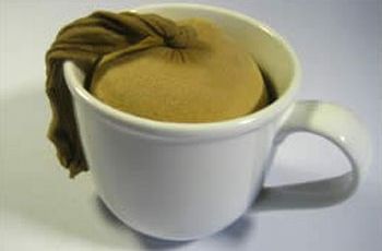 Em seguida, estique a meia cortada anteriormente na borda da caneca ou do copo grande e deposite dentro da meia duas colheres de chá bem cheias das sementes escolhidas de acordo com a sua preferência.