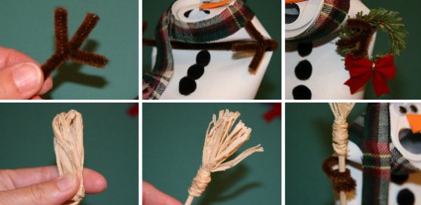 Cole os galhinhos marrons nas laterais da latinha, bem no vinco formado na lata. E cole em um dos galhinhos a guirlanda. Faça a vassoura do boneco dobrando as tiras de palha ao meio, cortando as pontas e colando no palito. Para finalizar cole a vassoura no outro galhinho marrom. E está pronto seu boneco de neve com latinha!