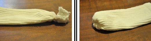 Em seguida, vire a meia do avesso e coloque um pedaço de elástico firmemente amarrado na parte superior da meia. Logo após, vire a meia para o lado direito novamente.