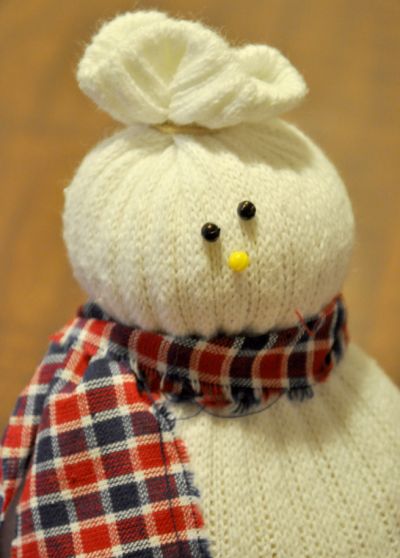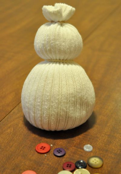 Coloque um elástico no topo da meia já cheia de arroz, e outro pedaço do elástico um pouco mais para baixo, formando a “cabeça” do boneco de neve.