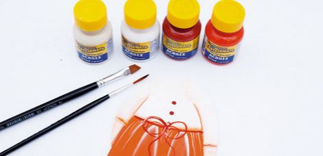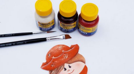 Comece utilizando a lixa para alisar o MDF. Transfira o molde do vestido para o MDF e o molde da cabeça para o EVA. Utilizando o pincel angular nº 14 e as tintas amarelo-pele, laranja e marrom, pinte o rostinho. Com o pincel chato nº 16 e as tintas branca e laranja, pinte a camisa e a saia da menina.