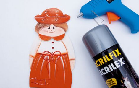 Com a cola quente cole a cabeça no corpo e o suporte retangular na parte de trás da menina. Finalize aplicando verniz spray e está pronto seu boneco!