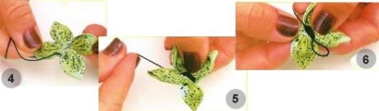Logo após, junte os quatro “triângulos” franzidos de forma que fique dois de cada lado, já formando as asas da borboleta. E com a mesma linha que está na agulha e que você usou para unir os quatro “triângulos” você deve dar várias voltas ao redor do centro da borboleta, para formar o “corpinho” da borboleta. E quando achar que já está bom a quantidade de voltas que você deu com a linha você deve dar mais uma volta, mas desta vez deixando uma laçada solta no topo. Arremate a linha.