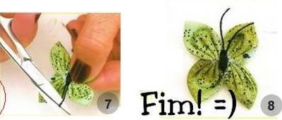 Para finalizar a sua borboleta basta que você corte a laçada ao meio, formando as anteninhas. E está pronta a sua borboleta de fuxico!