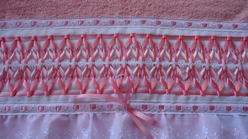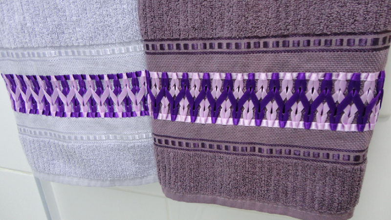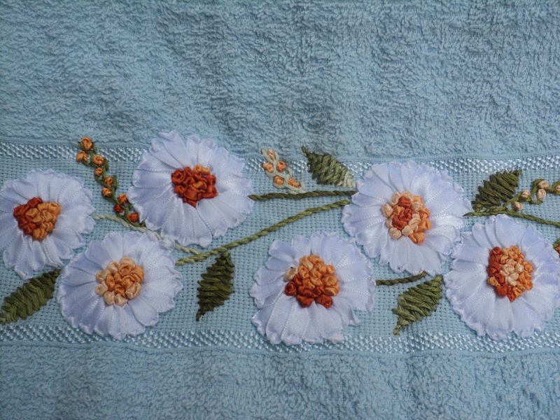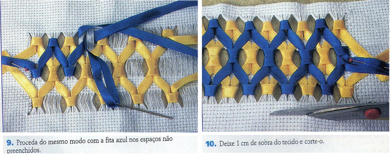 Faça o mesmo processo com outra cor de fita e usando os fios que estão soltos. Para finalizar a sua peça, após cortar as pontas da fita e prender, faça um bonito arremate, costurando à mão, se for toalha, ou colocando para baixo, caso esteja bordando uma tira de étamine para costurar sobre uma peça. E está pronto!
