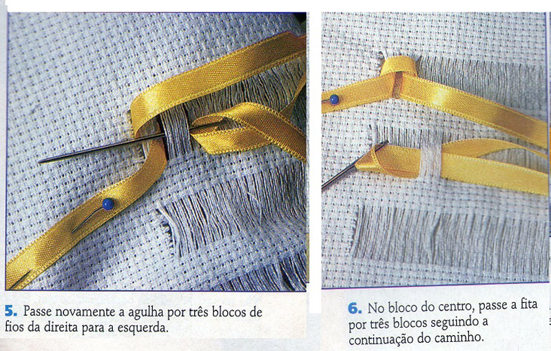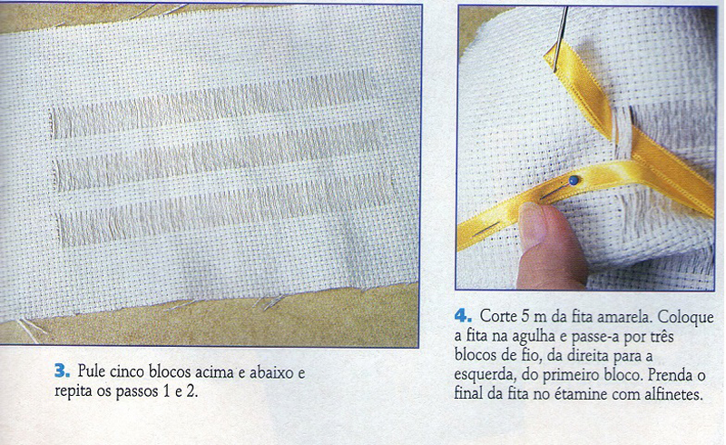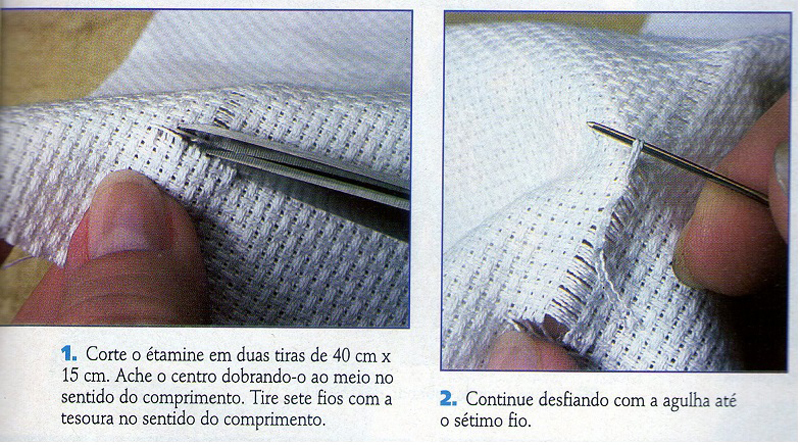 Faça três tiras de cortes no étamine. Prenda a ponta da fita, com o auxílio do alfinete para costura. Passe a agulha com a fita por 3 blocos de fios.