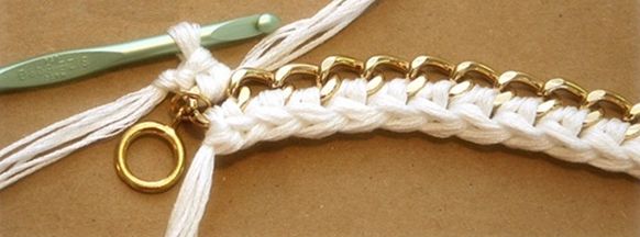 Faça um nó na linha, deixando uma sobra, e faça pontos baixos de crochê no outro lado da sua pulseira de corrente.
