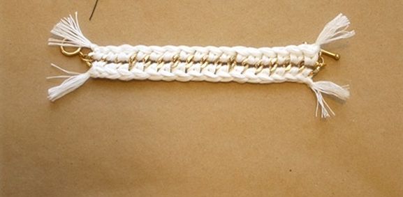 Faça um nó na linha, deixando uma sobra, e faça pontos baixos de crochê em um dos lados da sua pulseira de corrente. Quando chegar ao final, faça nós, para ficar bem firme e corte a linha, mas deixando uma sobra, se você quiser este detalhe.