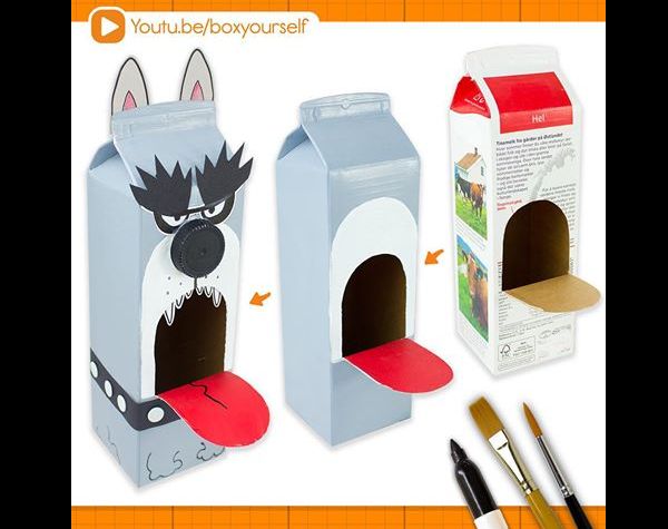 Recorte um dos lados da caixa de leite em formato de “porta de castelo”, para ser a língua do cãozinho. Deixe a aba para fora. Forre o local onde você vai trabalhar com a sua peça, com jornal velho, papel velho, papelão, tecido velho ou plástico. Pinte a sua caixa de leite com as cores que você desejar, porém, seguindo os detalhes do cachorrinho, pintando a língua de vermelho e a parte superior oval de branco. Nos papéis estruturados corte dentes, orelhas, olhos, coleira e outros detalhes que você desejar. Pinte e faça detalhes nestas partes. Para finalizar a sua peça, cole as partes soltas e desenhe os detalhes que você desejar. E está pronto!