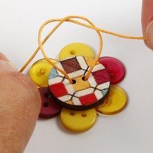 Agora, corte um pedaço de cordão escolhido, passe pelos furos do botão maior central e faça alguns nós, para manter o cordão no lugar, de forma bem firme.