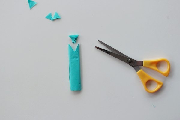 Para fazer outro modelo de flor com papel de seda, “sanfone” a tira de papel de seda, mas corte a ponta em formato de bandeirinha de festa junina.