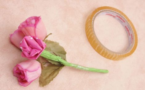 Com a fita adesiva junte a rosa feita com papel a um raminho de flores artificiais. Faça isso com as sete rosas de papel.