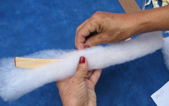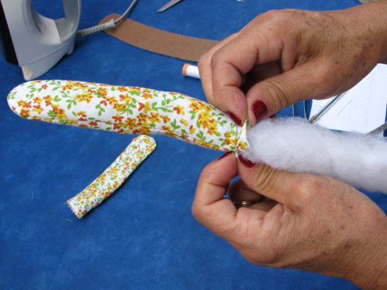 Agora, recoloque o gancho no lugar e prenda uma faixa de tecido na emenda das duas partes de tecido.